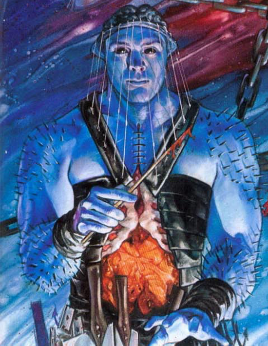 A taller Cenobite with an exposed brain, with wires holding the skin to his clothes. His chest is pried open to show his organs. He has spikes coming out of his shoulders and forearms. On his belt, he carries three large butcher knives