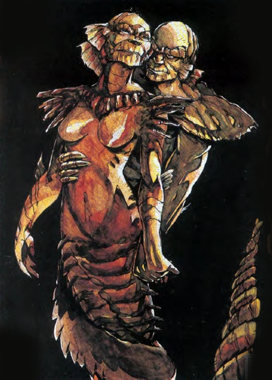 This pair of demons both appear as snake-like creatures with humanoid heads and bodies, although Basilisk is more masculine as he is the male counterpart of Chidna. Once order was won by the Vasa Iniquitatis, Chidna and Basilisk were returned to their natural state and continued their dance in calm.