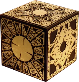 A Puzzle Box or LeMarchand Box, is a fictional lock puzzle or puzzle box created by the fictional antagonist Philip LeMarchand, an 18th Century French architect, artisan and designer of some infamy. He first created his designs as bizarre, intricately designed music boxes, as he was well known as a maker of mechanical singing birds. But as a devotee of the occult, he became obsessed with the supernatural which directly influenced the creation of the first puzzle box, known as the 'Lament Configuration' or "The Box of Sorrows". When solved, a dolorous bell can be heard tolling, as if from a distance, announcing the arrival of the Cenobites, extra dimensional beings that serve the lord and master of Hell - Leviathan.