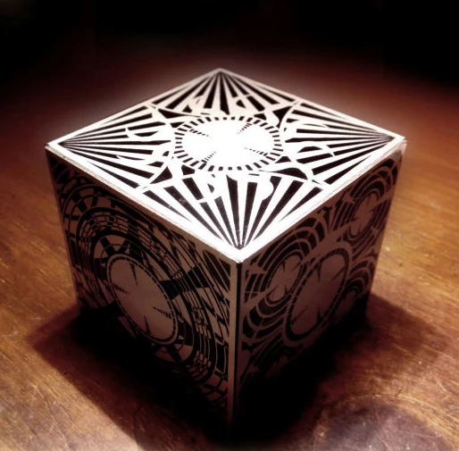 A Puzzle Box or LeMarchand Box, is a fictional lock puzzle or puzzle box created by the fictional antagonist Philip LeMarchand, an 18th Century French architect, artisan and designer of some infamy. He first created his designs as bizarre, intricately designed music boxes, as he was well known as a maker of mechanical singing birds. But as a devotee of the occult, he became obsessed with the supernatural which directly influenced the creation of the first puzzle box, known as the 'Lament Configuration' or "The Box of Sorrows". When solved, a dolorous bell can be heard tolling, as if from a distance, announcing the arrival of the Cenobites, extra dimensional beings that serve the lord and master of Hell - Leviathan.