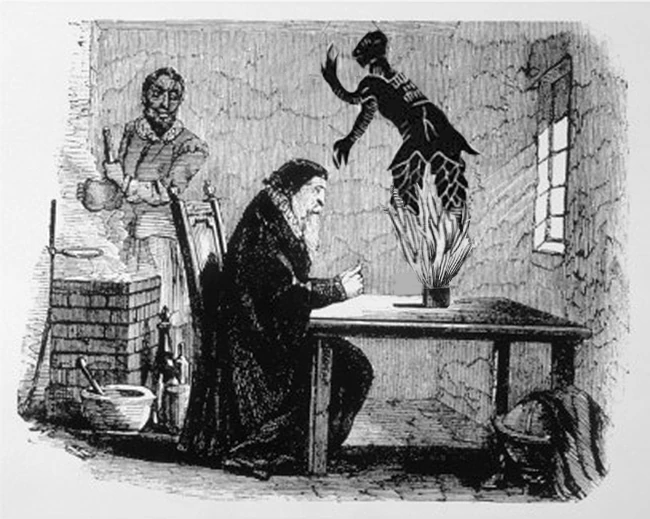 A woodcut depicting John Dee and his assistant Edward Kelley, summoning a 'Coenobyte' using a cube device similar to the constructs made by Albertus Magnus.